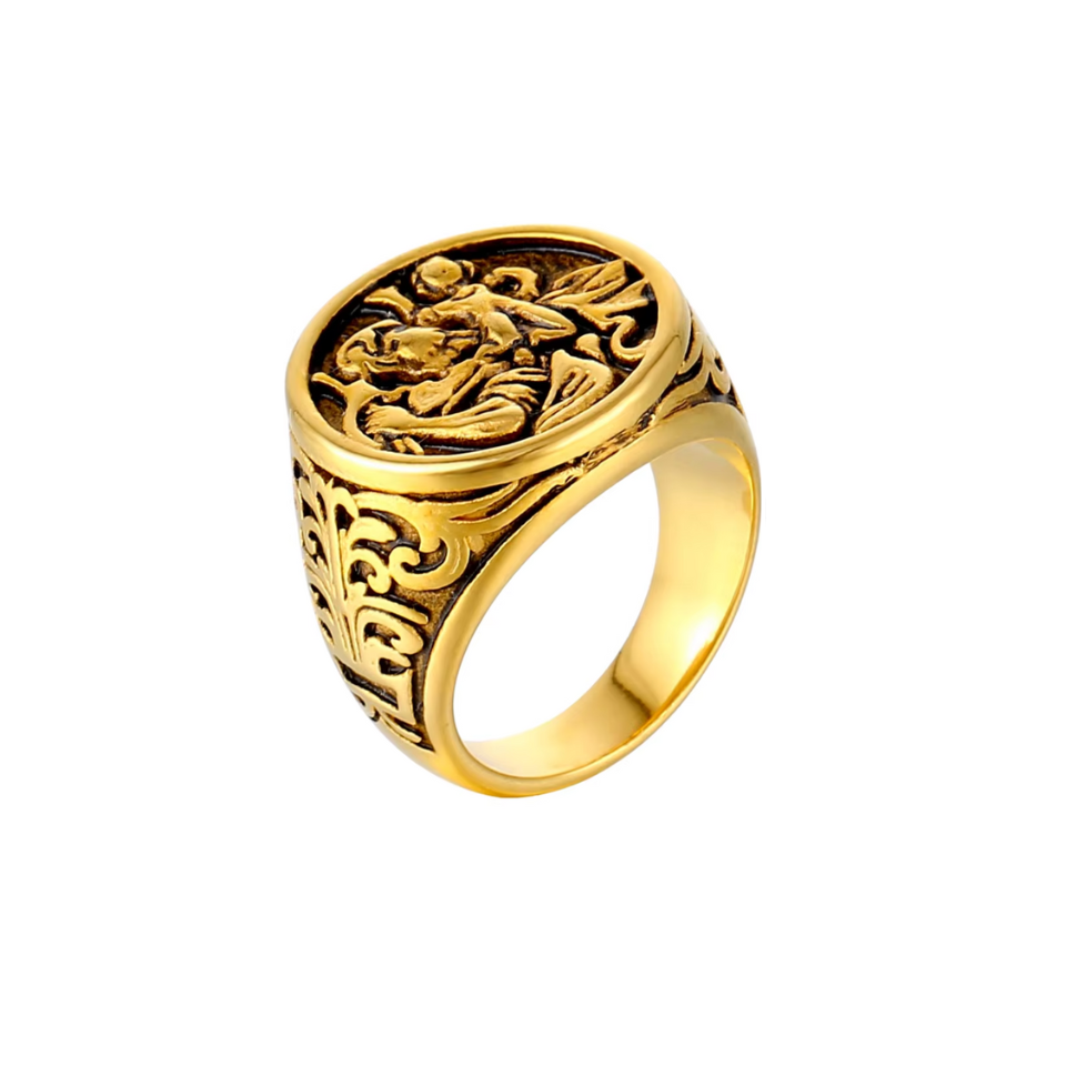This St. Christopher ring showcases the revered saint, known for offering protection and strength to those who travel. With elegant design, it serves as a constant reminder of guidance and safety, making it an ideal piece for anyone on a personal journey or adventure.